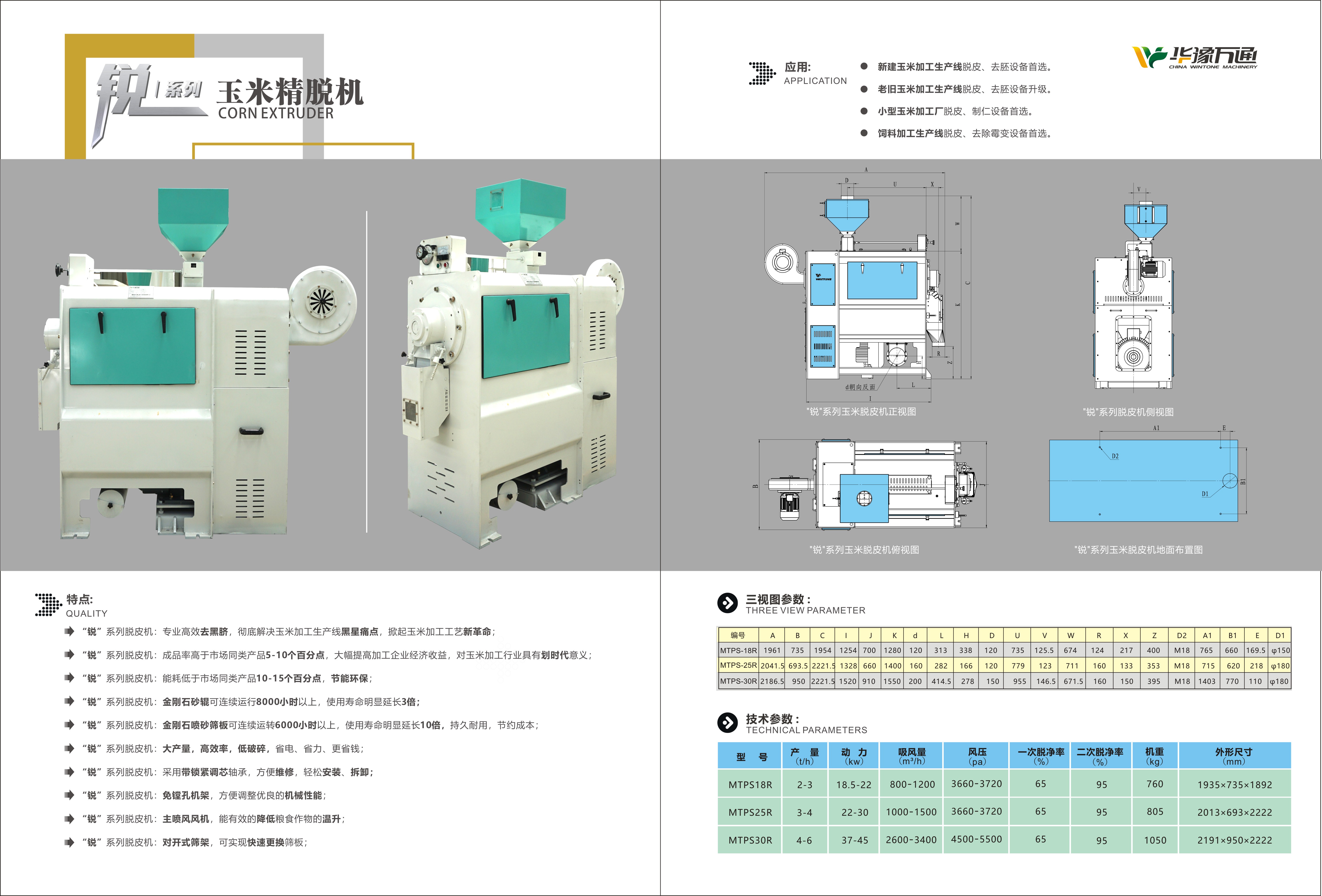 機(jī)器概述: 華豫萬通“銳‘系列脫皮機(jī),摒棄傳統(tǒng)脫皮機(jī)“碾磨”的加工方式,采用“干式切削剝”技術(shù),可實(shí)現(xiàn)對玉米胚乳的分層精細(xì)切削剝離及胚芽的一次性剝除,從而達(dá)到對脫皮物料的很小破碎率和很佳脫皮效果。一次脫凈率60%,二次脫凈率達(dá)95%以上。 同時,相對傳統(tǒng)脫皮機(jī),同樣功率, 產(chǎn)量提升1.5-2倍,節(jié)能降耗,迅速提升玉米加工企業(yè)利潤點(diǎn)。同樣的產(chǎn)量比效果,同樣的效果比能耗。 機(jī)器應(yīng)用: *新建玉米加工生產(chǎn)線脫皮、去胚設(shè)備。 *老舊玉米加工生產(chǎn)線脫皮、去胚設(shè)備升級。 *小型玉米加工廠脫皮、制仁設(shè)備。 *飼料加工生產(chǎn)線脫皮、去除霉變及粗纖維設(shè)備。 機(jī)器圖片及參數(shù): 機(jī)器特點(diǎn): “銳”系列脫皮機(jī):專業(yè)高效去黑臍,解決玉米加工生產(chǎn)線黑星痛點(diǎn),掀起玉米加工工藝新潮流; “銳”系列脫皮機(jī):成品率高于市場同類產(chǎn)品5-10個百分點(diǎn),大幅提高加工企業(yè)經(jīng)濟(jì)收益,對玉米加工行業(yè)具有意義重大; “銳”系列脫皮機(jī):能耗低于市場同類產(chǎn)品10-15個百分點(diǎn),節(jié)能環(huán)保; “銳”系列脫皮機(jī):金剛石砂輥可連續(xù)運(yùn)行8000小時以上,使用壽命明顯延長3倍; “銳”系列脫皮機(jī):金剛石噴砂篩板可連續(xù)運(yùn)轉(zhuǎn)6000小時以上,使用壽命明顯延長10倍,持久耐用,節(jié)約成本;“銳”系列脫皮機(jī):大產(chǎn)量,低破碎,省電、省力、更省錢; “銳”系列脫皮機(jī):采用帶鎖緊調(diào)心軸承,方便維修,輕松安裝、拆卸; “銳”系列脫皮機(jī):免鏜孔機(jī)架,方便調(diào)整出優(yōu)良的機(jī)械性能; “銳”系列脫皮機(jī):主軸噴風(fēng)風(fēng)機(jī),能有效的降低糧食作物的溫升; “銳”系列脫皮機(jī):對開式篩架,可實(shí)現(xiàn)快速更換篩板; 產(chǎn)成品展示: 更多糧食加工設(shè)備:歡迎咨詢?nèi)A豫萬通 :0371-86635901